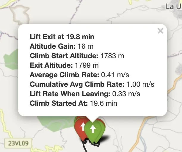 I’ve begun work on a set of tools to assist in my understanding of the decision I’m making as I’m navigating my paragliding flight.  One part of the tools helps me understand when I made good and bad decisions to leave thermals and go on transition to find better lift.  The basic concept of this is that for a given day and window in that day thermals have an average strength.  The idea is to only take those thermals that are at or above that climb rate. One key point to remember however is that this not a hard and fast rule, it is a guideline.